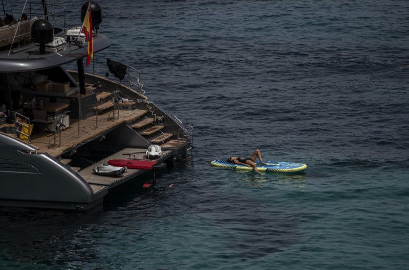 Una mujer toma el sol en una tabla junto a un barco, en la cala Comte. OLMO CALVO