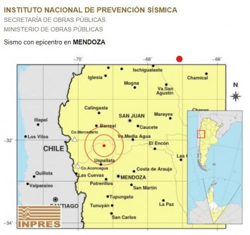 Según informa el Instituto de Prevención Sísmica (INPRES), con sede en San Juan, el primer movimiento se dio anoche, a las 23.32, con un temblor de 2.7 grados en la escala de Mercalli. El mismo tuvo como epicentro el norte de Uspallata y tuvo una profundidad de 129 kilómetros.