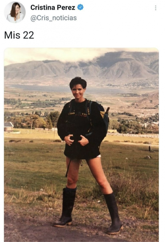 Cristina Pérez se sumó al desafío y compartió en Twitter una foto de cuando tenía 22 años. En la imagen se la puede ver con un look súper canchero, el cabello súper cortito y una espectacular geografía de fondo.