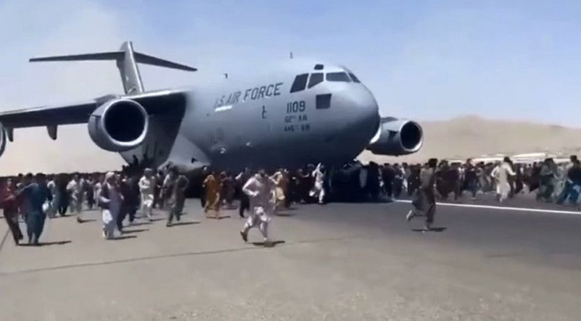 Captura de vídeo en la que se ve una multitud rodeando un avión militar de EE UU, este lunes en el aeropuerto de Kabul.