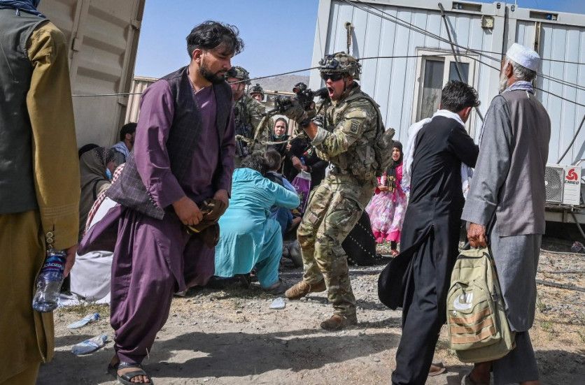 Un soldado estadounidense (en el centro) apunta con su arma hacia un afgano en el aeropuerto de Kabul, este lunes. WAKIL KOHSAR AFP