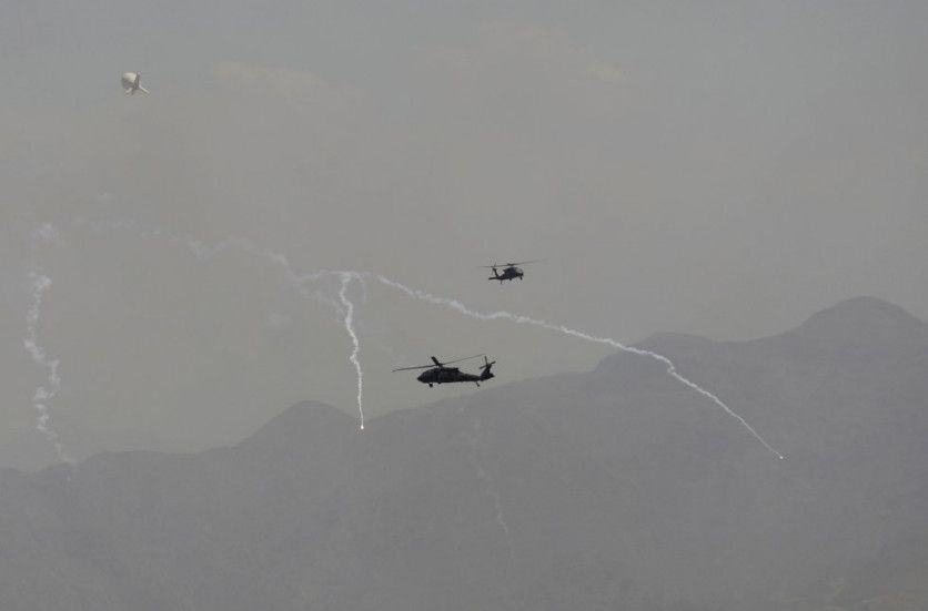 El presidente de Afganistán, Ashraf Ghani, abandonó el país el domingo después de que los talibanes tomaran el control de casi todo el territorio, en su mayor victoria en 20 años de guerra. En la imagen, dos helicópteros militares estadounidenses y un globo dirigible sobrevuelan Kabul, con la ayuda del lanzamiento de bengalas de señuelo antimisiles, el domingo. RAHMAT GUL AP