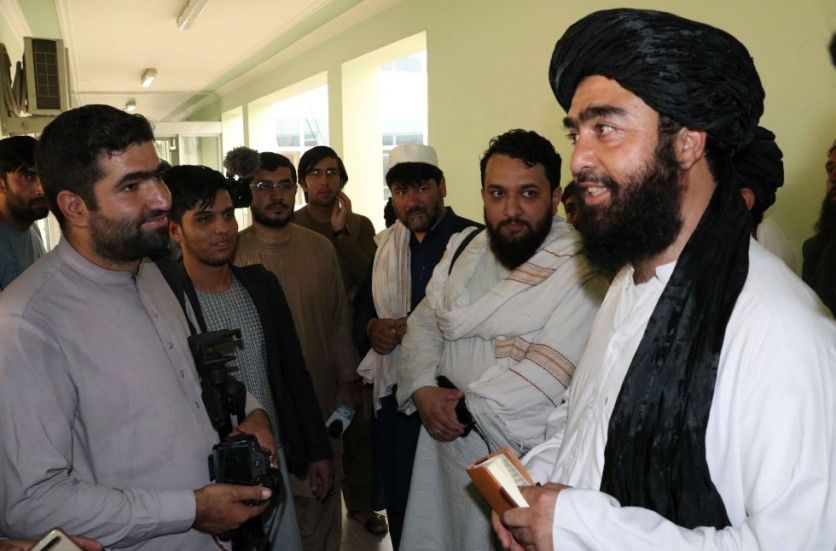 Ahmadullah Muttaqi (derecha), director de información y cultura de los talibanes habla con los periodistas, en Kandahar. EFE