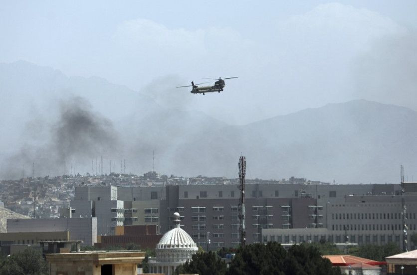 El personal de la Embajada de Estados Unidos en Kabul ha sido trasladado de urgencia hacia el aeropuerto de la capital afgana, donde fueron enviados miles de soldados estadounidenses, según el secretario de Estado, Antony Blinken. En la imagen, un helicóptero militar estadounidense sobrevuela Kabul, el domingo. RAHMAT GUL AP