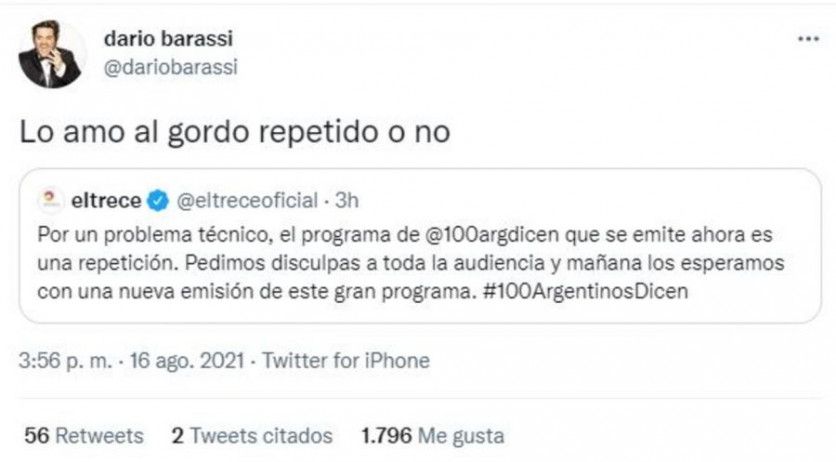Este lunes, día feriado en toda la Argentina, El Trece puso al aire la emisión del viernes pasado de 100 argentinos dicen. Las redes ardieron y Darío Barassi dejó un picante comentario sobre el tema, muy a su estilo.