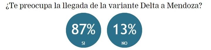 Ante la consulta "¿Te preocupa la llegada de la variante Delta a Mendoza?", un contundente 87 por ciento de los encuestados respondió por la afirmativa, quedando en claro que hay una preocupación manifiesta de los habitantes en cuanto a la llegada de contagiosa cepa.