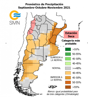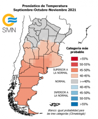 Para los meses comprendidos entre septiembre y noviembre de 2021 se observa una mayor probabilidad que la temperatura media sea, en promedio, más cálida que lo habitual en gran parte del país. Las regiones con las mayores probabilidades de ocurrencia de esta categoría (45%-50%) son Patagonia, oeste de Buenos Aires y la provincia de La Pampa.