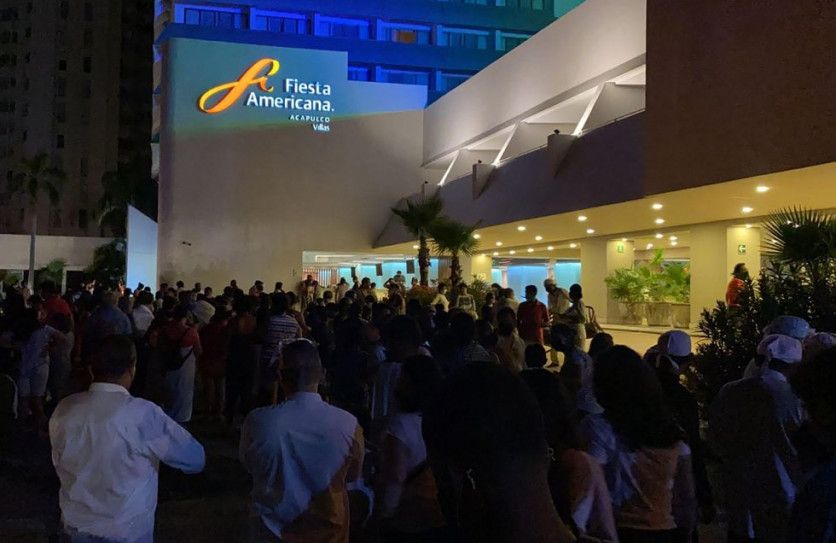 Decenas de personas evacuadas a las afueras de un hotel en Acapulco tras el seísmo. El terremoto se ha registrado justo en el aniversario de otro de magnitud 8,2 que se produjo en Oaxaca en 2017, que causó un centenar de muertes. FRANCISCO ROBLES AFP