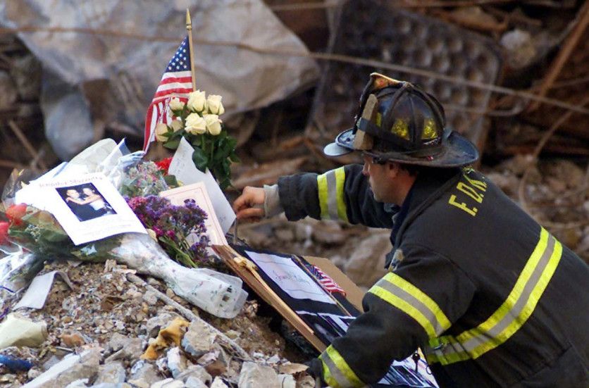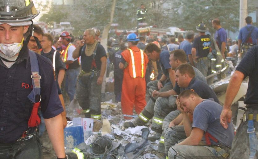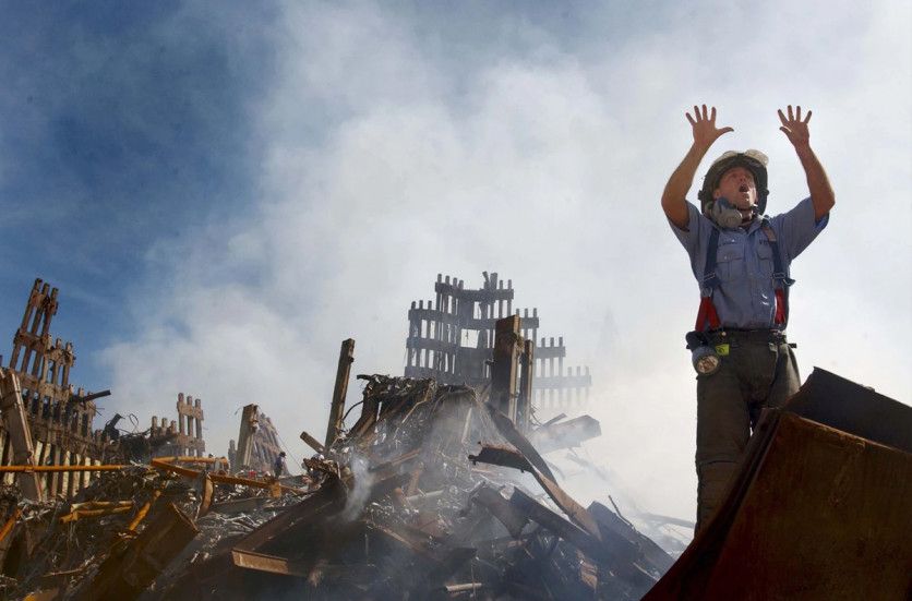 Un bombero pide ayuda a otros díez compañeros. La escena corresponde a los días posteriores al atentado, cuando aún buscaban sobrevivientes. (Foto: Preston Keres/Getty Images)