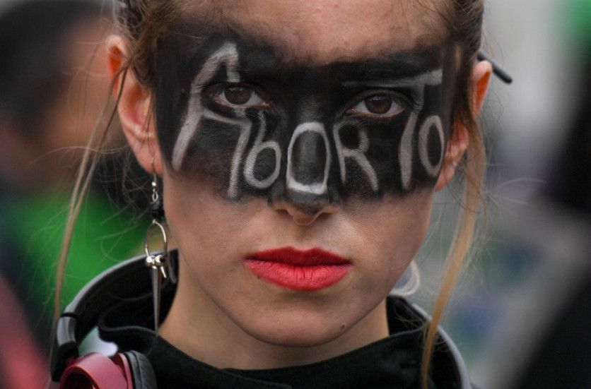 Una manifestante con la palabra "Aborto" pintada en la cara, durante las protestas en Bogotá (Colombia) de este martes. JUAN BARRETO AFP