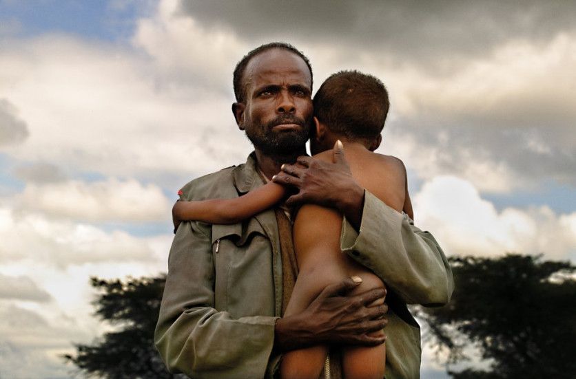 13. Oromía, Etiopía, 2008. Era una emergencia nutricional en una zona de Etiopía donde la desnutrición ya es endémica. La sequía y las plagas de langostas habían vuelto a dejar baldíos todos los terrenos de la región, y las cosechas habían dejado de serlo. No llovía y, si lo hacía, quedaba todo anegado. Numerosas madres se arremolinaban a las puertas del centro nutricional, pero la imagen apareció de repente. Un padre llevaba a su hijo en brazos. Me sorprendió. No era lo habitual, aunque lo más llamativo era su mirada. Se llamaba Abebaye y el niño, Basada Moti. Volví a la región al cabo de un tiempo y los visité en su aldea. (Oromía, Etiopía, 2008). JUAN CARLOS TOMASI MSF