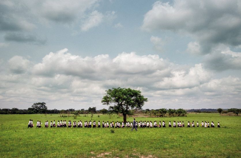 14. Dikuluy, Alto Katanga, República Democrática del Congo, 2015. Tuve que correr, y mucho, para captar esta imagen. Estábamos vacunando en una pequeña escuela del Alto Katanga, antigua zona minera, cuando de repente se llenó la estancia. Era de aquellas veces en que cuesta tener una visión amplia de la situación. De repente, Pau Miranda, mi compañero de viaje, entró gritando y gesticulando para que saliera. Salí como pude y me fui corriendo tras él. En cuestión de segundos, me di cuenta: una fila de escolares cantando por aquellas tierras. Tenía que buscar el plano general y darme prisa, porque no se detenían. Su paso marcial casi me desfonda. Luego nos presentamos. JUAN CARLOS TOMASI MSF