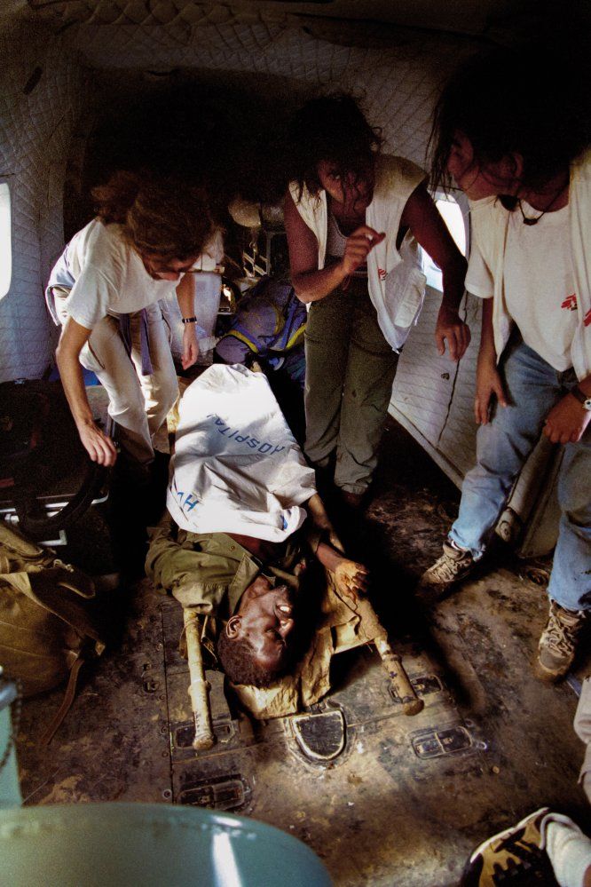 15. Beira, Mozambique, 2000. Durante las inundaciones de Mozambique, en la gran mayoría de los viajes, el helicóptero transportaba material logístico y médico, aunque a veces también hacía las funciones de ambulancia. En más de una ocasión, en algún pequeño hospital o en algún centro de salud aislado, nos encontramos a personas heridas en estado crítico. No había personal médico, ya que, con la subida del agua, los equipos sanitarios locales no podían viajar por carretera. JUAN CARLOS TOMASI MSF