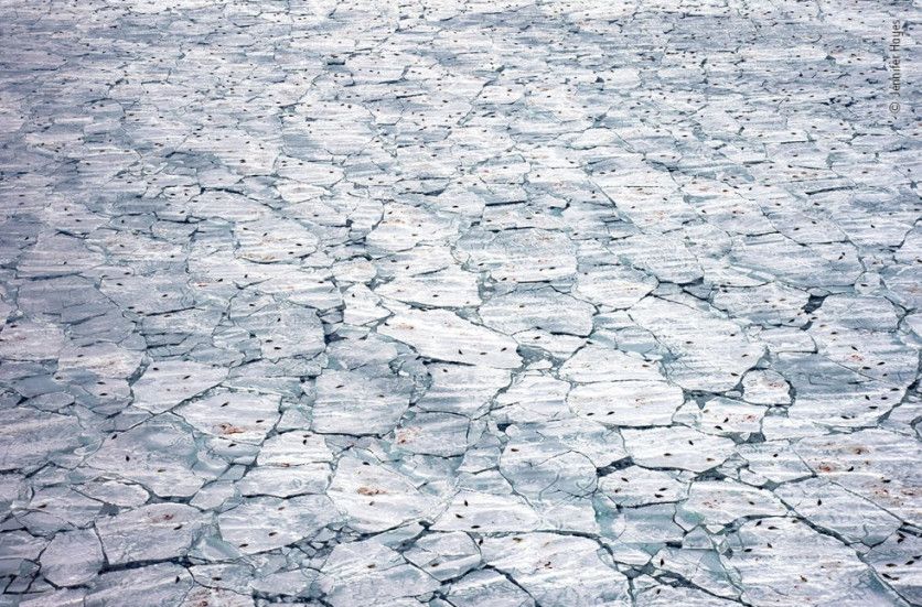 Categoría: océanos, la mirada amplia Jennifer Hayes (EE UU) graba focas arpa, crías de foca y la sangre del nacimiento contra el hielo marino que se derrite. Tras una tormenta, fueron necesarias horas de búsqueda en helicóptero para encontrar esta fractura en el hielo utilizada como plataforma de parto por las focas arpa. "Era un pulso de vida que te dejaba sin aliento", dice Jennifer. Todos los otoños, las focas arpa migran al sur desde el Ártico, hacia sus zonas de cría, retrasando los nacimientos hasta que se forma el hielo marino. Las focas dependen del hielo, por lo que es probable que el cambio climático afecte a las poblaciones futuras. JENNIFER HAYES/WILDLIFE PHOTOGRAPHER OF THE YEAR NHM