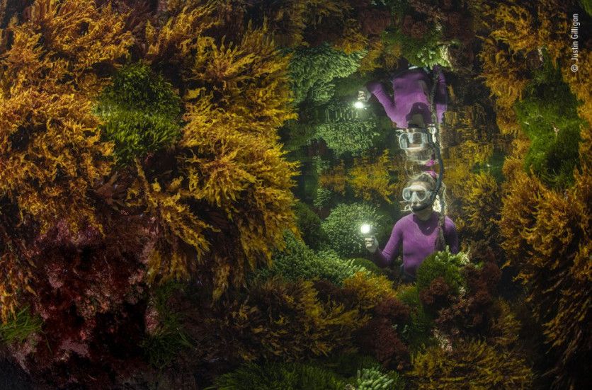 ategoría: plantas y hongos Justin Gilligan (Australia) fotografía el reflejo de un guardián marino entre las algas. En el arrecife tropical más meridional del mundo, Justin quería mostrar cómo la cuidadosa gestión humana ayuda a preservar esta vibrante selva de algas. Con sólo una ventana de 40 minutos en la que las condiciones de la marea eran las adecuadas, Justin necesitó tres días de ensayo y error antes de conseguir su imagen. Los efectos del cambio climático, como el aumento de la temperatura del agua, están afectando a los arrecifes a un ritmo cada vez mayor. Los bosques de algas mantienen cientos de especies, capturan carbono, producen oxígeno y ayudan a proteger las costas. JUSTIN GILLIGAN/WILDLIFE PHOTOGRAPHER OF THE YEAR NHM