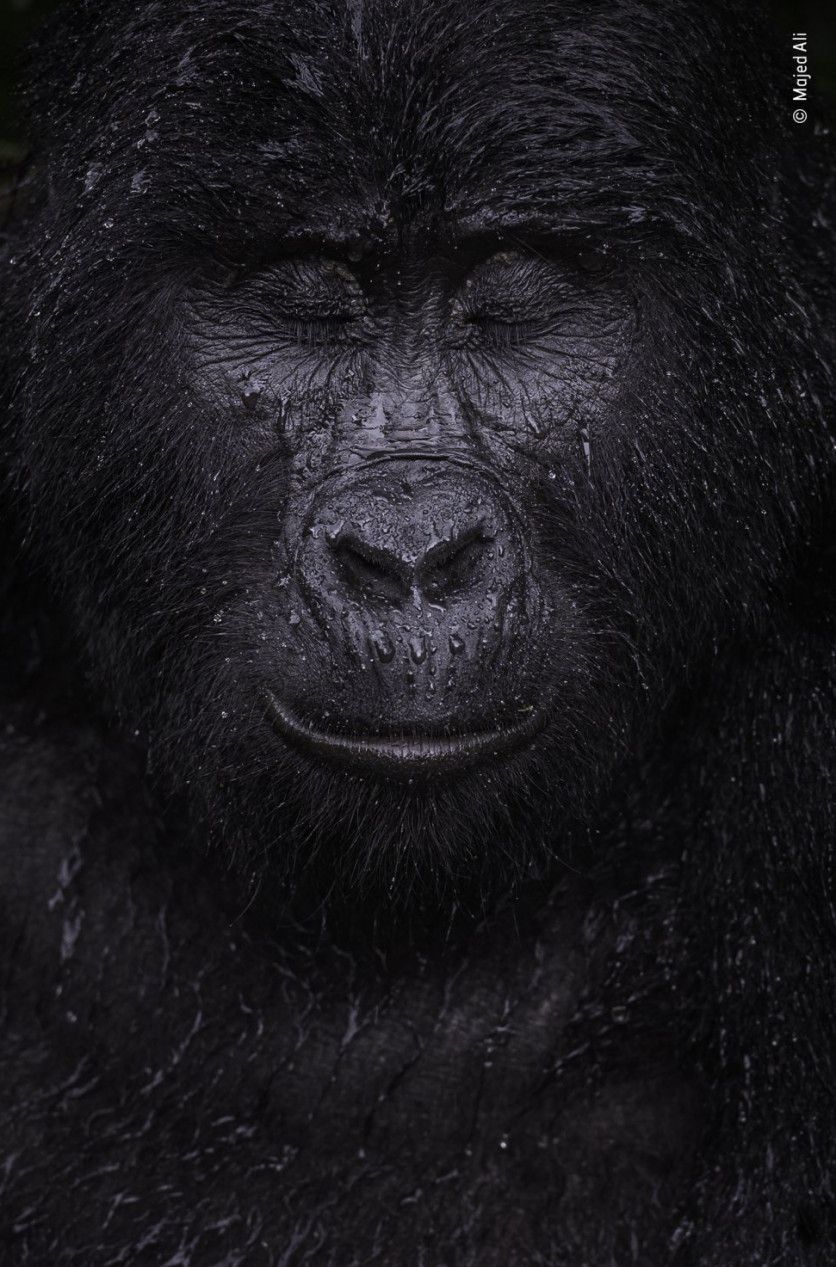Categoría: retrato animal Majed Ali (Kuwait) vislumbra el momento en que un gorila de montaña cierra los ojos bajo la lluvia. Majed caminó durante cuatro horas para conocer a Kibande, un gorila de montaña de casi 40 años. "Cuanto más subíamos, más calor y humedad había", recuerda Majed. Cuando empezó a llover, Kibande permaneció al aire libre y pareció disfrutar del chaparrón. Los gorilas de montaña son una subespecie de gorila oriental y se encuentran a más de 1.400 metros de altura en dos poblaciones aisladas: en los volcanes Virunga y en Bwindi. Estos gorilas están en peligro de extinción debido a la pérdida de hábitat, las enfermedades, la caza furtiva y la alteración del hábitat causada por la actividad humana. MAJED ALI/WILDLIFE PHOTOGRAPHER OF THE YEAR NHM