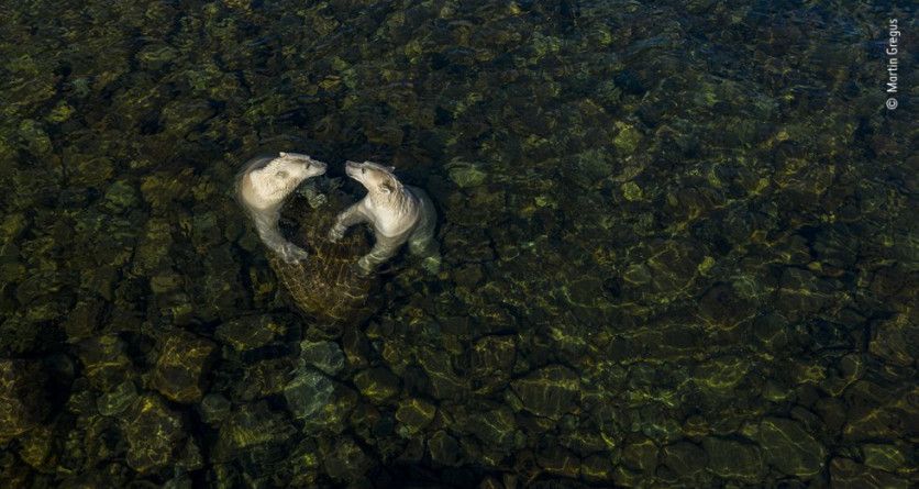 Categoría: cartera 'Futura estrella' Martin Gregus (Canadá/Eslovaquia) retrata a los osos polares bajo una luz diferente cuando llegan a la orilla en verano. Martin pasó tres semanas en su barco utilizando diversas técnicas para fotografiar a los osos polares alrededor de la bahía de Hudson. Los osos polares son en su mayoría solitarios y, mientras viven en el hielo marino, pueden dispersarse por vastas zonas. Al llegar a tierra en verano, viven principalmente de sus reservas de grasa y, con menos presión para encontrar comida, se vuelven mucho más sociables. Aunque no quiere restar importancia a su difícil situación ante el cambio climático, Martin quería mostrar a los osos polares bajo una luz diferente. MARTIN GREGUS/WILDLIFE PHOTOGRAPHER OF THE YEAR NHM