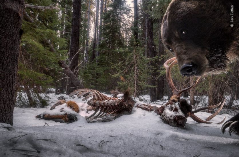 Categoría: animales en su hábitat Zack Clothier (Estados Unidos) descubre que un oso grizzly se ha interesado por su cámara trampa. Zack decidió que estos restos de alce macho eran un lugar ideal para colocar una cámara trampa. Volver al lugar fue todo un reto. Zack tuvo que sortear el agua de deshielo con los árboles caídos, para encontrarse con que su instalación estaba destrozada. Este fue el último fotograma capturado por la cámara. Los grizzlies, una subespecie de los osos pardos, pasan hasta siete meses en letargo, una forma ligera de hibernación. Al emerger en primavera, están hambrientos y consumen una gran variedad de alimentos, incluidos los mamíferos. ZACK CLOTHIER/WILDLIFE PHOTOGRAPHER OF THE YEAR NHM