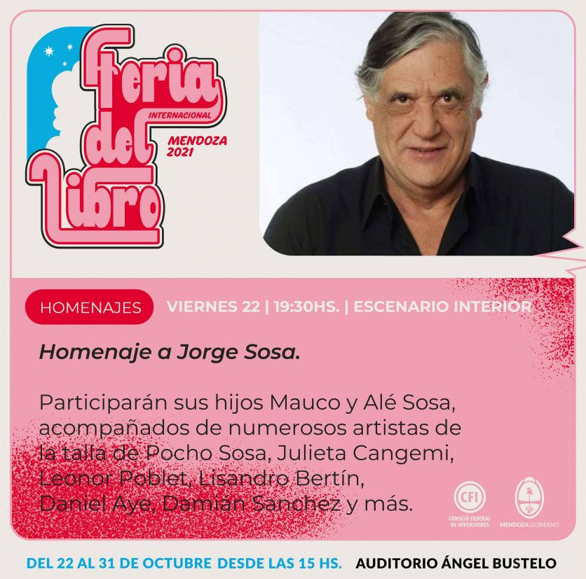 La Feria Internacional del Libro Mendoza 2021 contará con presentaciones de libros, charlas, invitados especiales, conciertos, espacios de inclusión, para niños y gastronómicos y homenajes a grandes referentes de nuestra cultura. El primero será para Jorge Sosa, un ícono de la mendocinidad, informa el Ministerio de Cultura y Turismo en un comunicado de difusión.