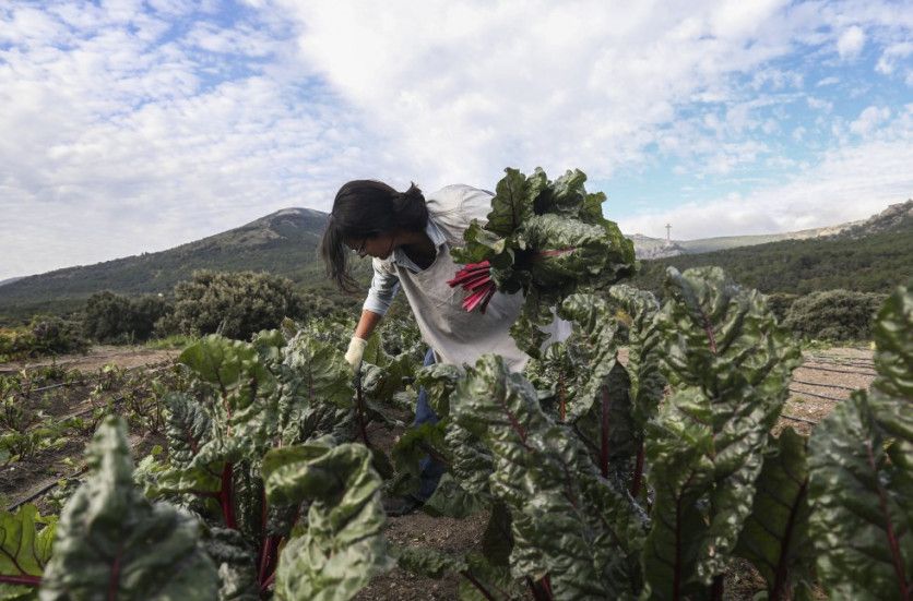 Natalia Sánchez de Pedro recoge acelgas rojas en el huerto propio del restaurante Coque (dos estrellas Michelin), situado en El Escorial, a unos 50 kilómetros de la capital. "Es importante por sostenibilidad, porque así quitas transporte, pero también por trazabilidad: nosotros decidimos cuándo recogemos la verdura y la servimos ese mismo día en Coque", dice Diego Sandoval, jefe de sala. AITOR SOL