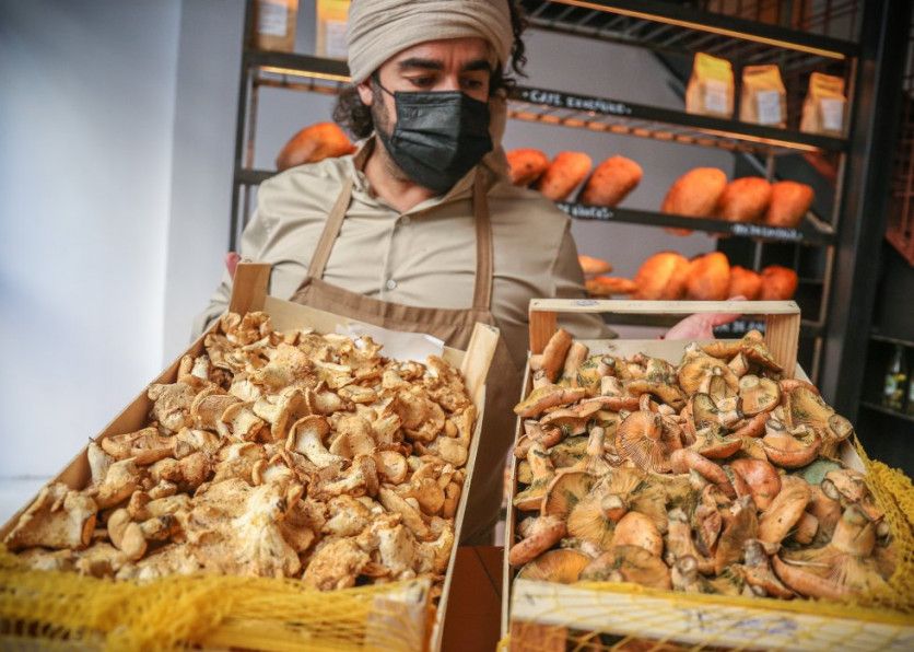 Un cocinero del restaurante Mo de Movimiento muestra setas de temporada que acaban de recibir de un productor local. "El 60% de lo que compramos es directamente a productores, la mayoría pequeños y de proximidad, y el 95% es ecológico. No tenemos carne roja por su impacto ambiental", dice Felipe Turell, cofundador del espacio. AITOR SOL
