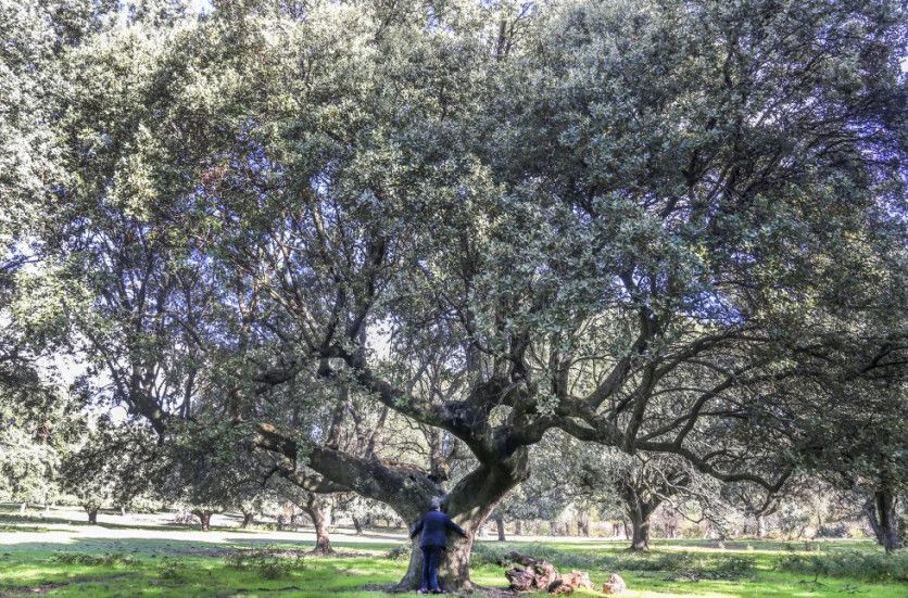 La finca de Coque, situada a unos 50 kilómetros del restaurante, dispone de huerto y de una gran dehesa donde pastan 200 toros cuya carne utilizan para hacer embutidos, solomillos y hamburguesas. En la imagen, el jefe de sala Diego Sandoval abraza una encina milenaria en la finca. AITOR SOL
