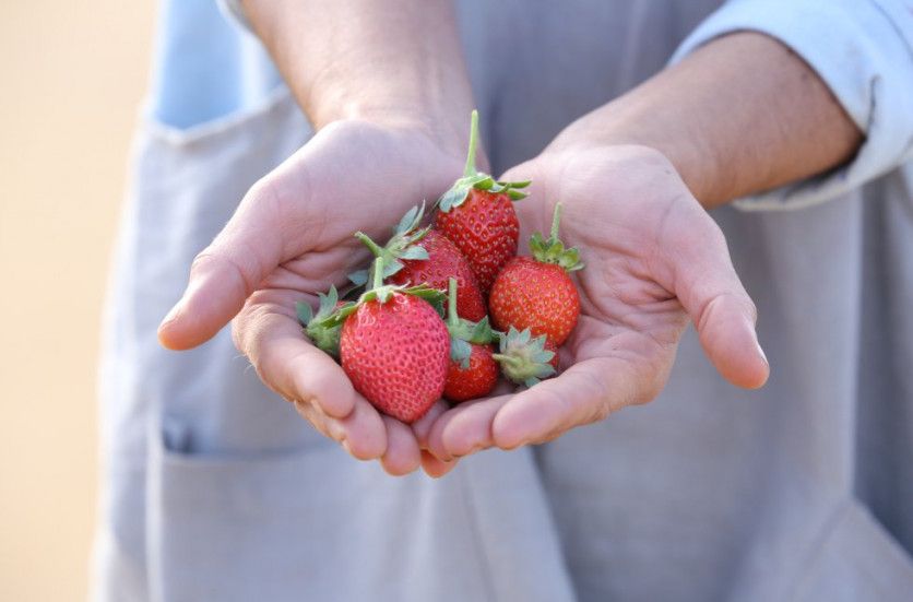Natalia Sánchez de Pedro, del Instituto Madrileño de Investigación y Desarrollo Rural, Agrario y Alimentario (Imidra), recoge unas fresas de temporada en la Finca El Jaral de la Mira, de la que se surte el restaurante Coque. AITOR SOL
