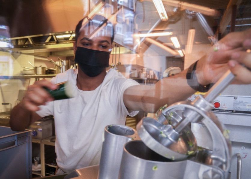 Un cocinero del restaurante Mo de Movimiento elabora un plato con verduras en la cocina del establecimiento. "Al consumidor siempre le ha gustado saber de dónde vienen las cosas y aquí apostamos por eso. Además, damos comida sostenible al precio más bajo que podemos", dice Felipe Turell. AITOR SOL