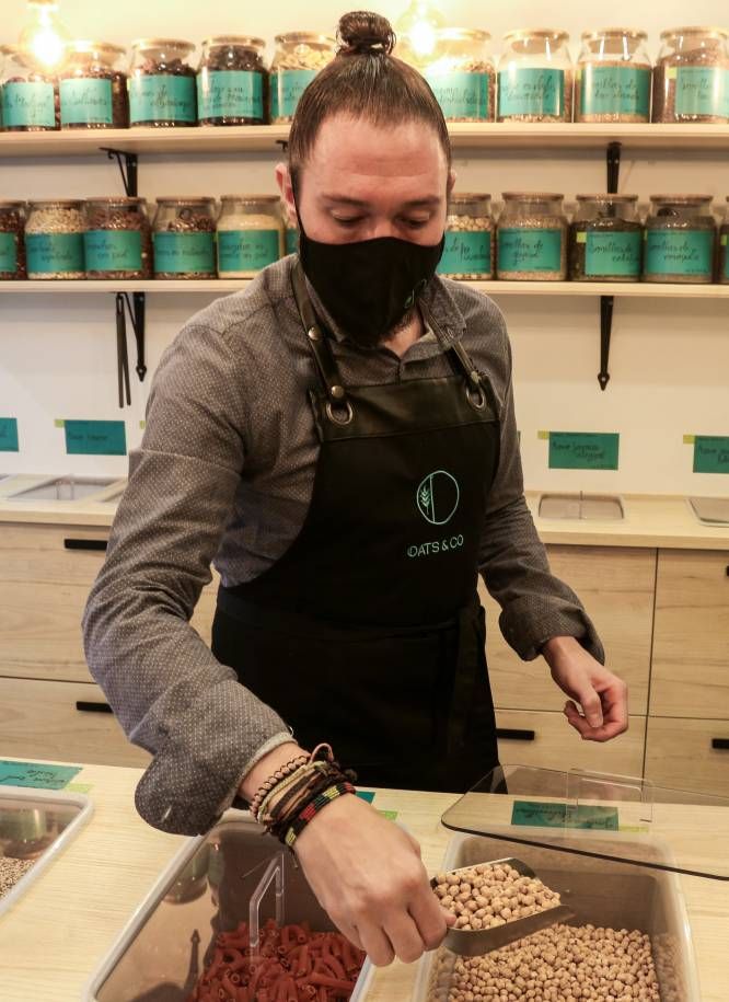 Iván Garzón, de Oats & Co, una tienda a granel del Mercado de Barceló (Madrid), maneja el concepto de proximidad: "Trabajamos con mucho producto de proximidad, la gente nos suele pedir legumbres de cercanía y ecológicas, aunque también traemos quinoa de Bolivia y arroz basmati de Pakistán, porque aquí no hay producción". AITOR SOL