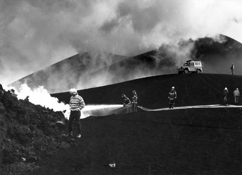 6) En Heimaey se ensayó el enfriamiento de las coladas de lava con agua a presión para intentar frenar su avance y salvar el puerto pesquero.