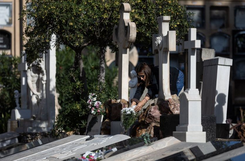 Una mujer coloca flores en una tumba en el cementerio de les Corts, este lunes en Barcelona. ALBERT GARCIA
