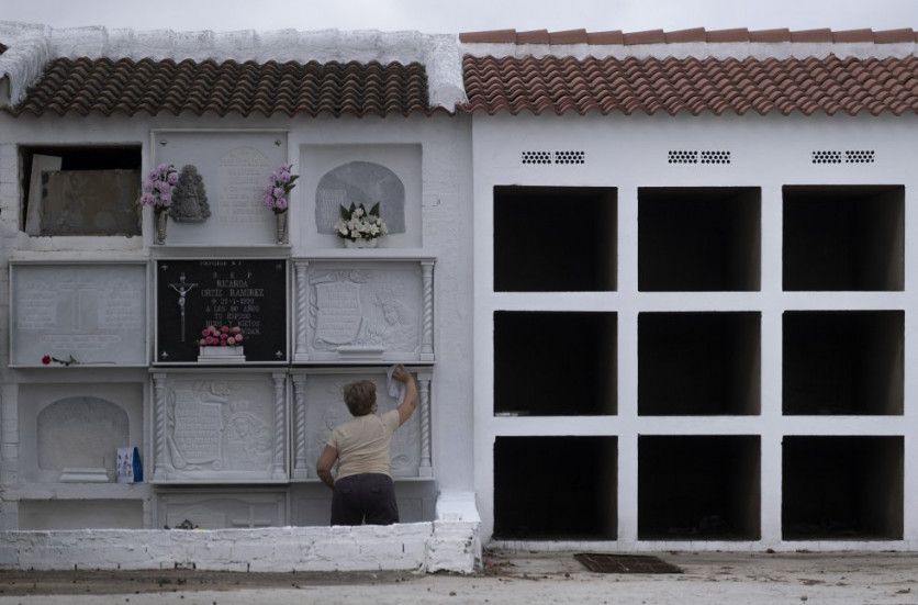Una mujer limpia una tumba en el cementerio de la localidad sevillana de Huévar del Aljarafe, este lunes. PACO PUENTES