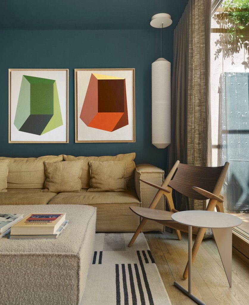 En el salón, pared en azul azafata. El sofá lo hizo a medida Margarita Ventura y la butaca es el modelo CH28 que Hans J. Wegner diseñó para Carl Hansen & Son. La mesa está diseñada por Max Enrich, la lámpara Tekiò la produce Santa & Cole y los lienzos pertenecen a la dueña. Los vende como Art by Mariona Espinet.