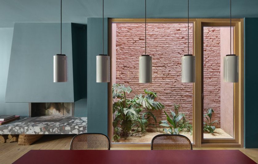 En el comedor, la mesa roja es un diseño a medida de Max Enrich. Las lámparas de techo son el modelo Cirio de Santa & Cole. Las sillas vienesas Thonet fueron compradas a Wiener GTV Design. La chimenea la ideó Espinet.