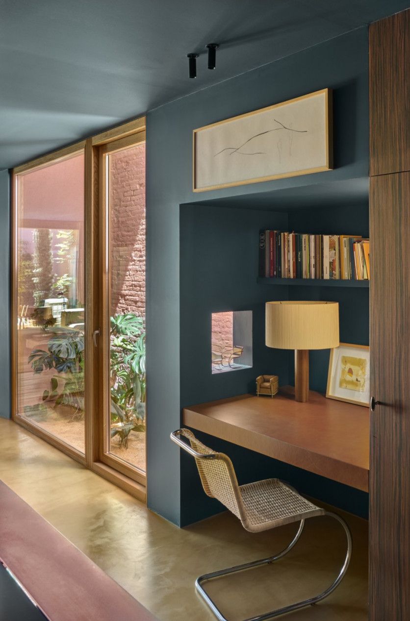 En la planta baja hay otra zona de trabajo. La lámpara es de Antoni de Moragas y la produce Santa & Cole. Como en el resto de la casa, el suelo es color tostado. Las texturas cambian según las estancias entre madera, moqueta o microcemento. Eugeni Pons