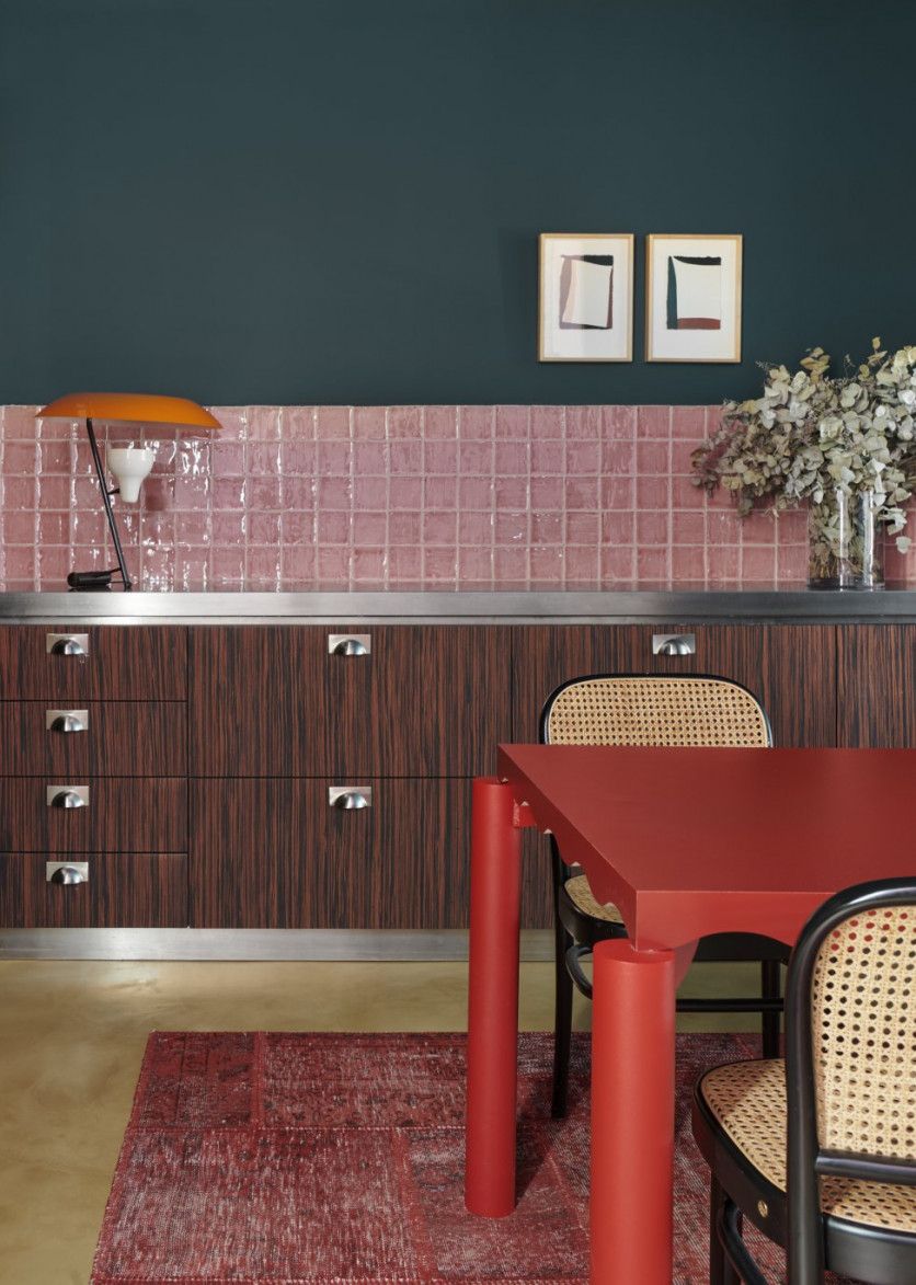 Espinet también ha diseñado la cocina, forrada de madera de zebrano. Sobre la encimera de acero inoxidable, la lámpara 548 de Flos. El alicatado artesanal rosa lo fabrica Matter Barcelona, y los cuadros son de Claudia Valsells. Eugeni Pons