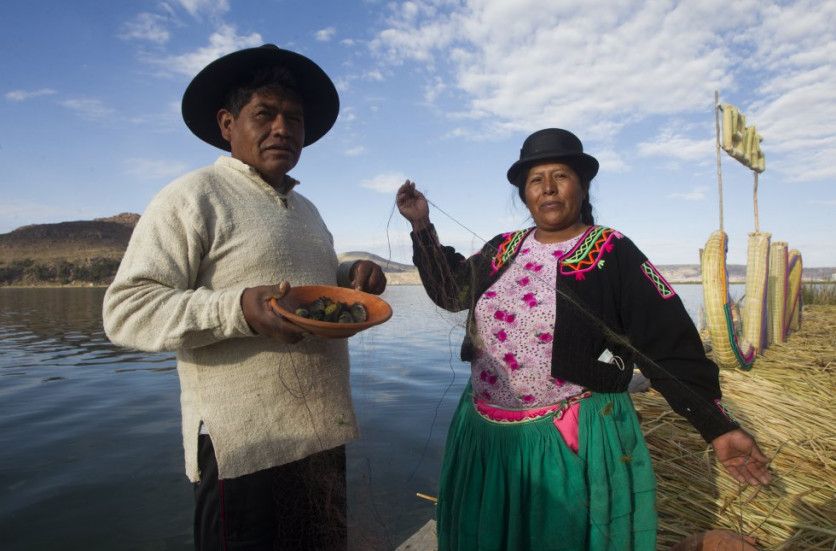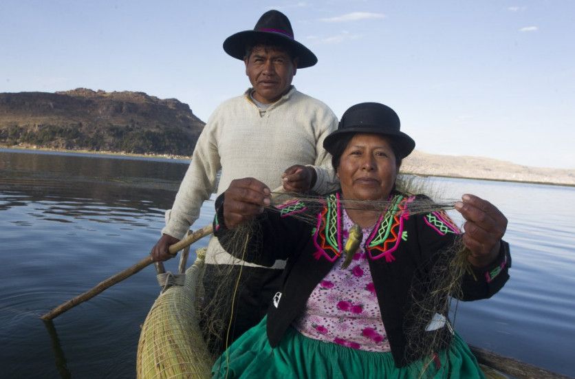 Enrique Cuno y Angélica Panca, una pareja de aimaras que se dedica a la artesanía y el turismo, pero no ha abandonado el ancestral arte de la pesca en el lago navegable más alto del mundo. JUAN CARLOS CISNEROS