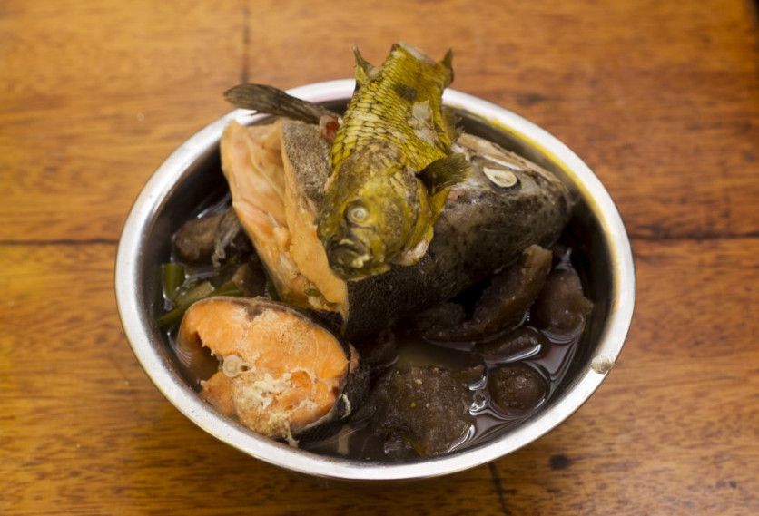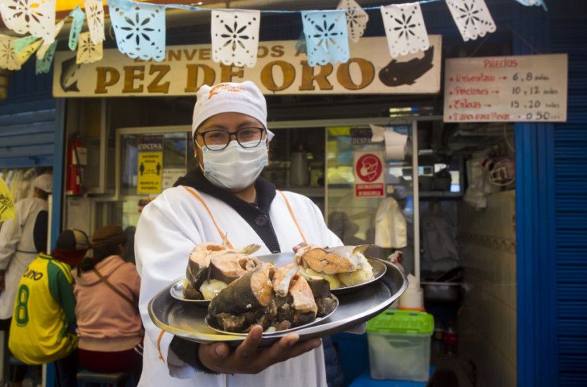Una empleada del restaurante El Pez de Oro muestra un plato de thimpu de trucha y carachi. La primera, especie introducida en el lago Titicaca, se mezcla no solo en sus aguas sino también en la gastronomía con la nativa. JUAN CARLOS CISNEROS