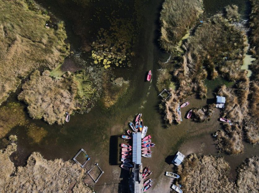 Vista aérea de un embarcadero del lago Titicaca. No hay cifras precisas de cuántas embarcaciones hay, porque existe mucha informalidad. Pero se estima que son 1.675. JUAN CARLOS CISNEROS