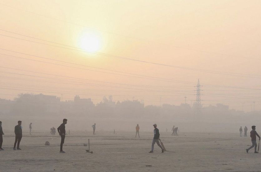 La gente juega al cricket en las llanuras aluviales del río Yamuna en una mañana con niebla en Nueva Delhi, India, el 17 de noviembre de 2021. REUTERS / Anushree Fadnavis