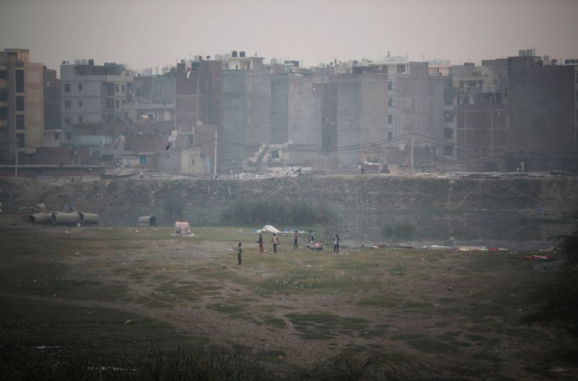 Los niños vuelan una cometa mientras las casas residenciales se ven envueltas en smog en Nueva Delhi, India, el 15 de noviembre de 2021. REUTERS / Adnan Abidi
