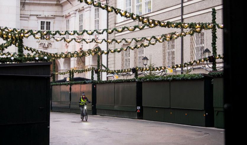Una ciclista recorre el mercadillo navideño clausurado en Salzburgo. "Necesitamos una acción decidida", dijo el ministro de Sanidad, el ecologista Wolfgang Mückstein, al justificar las fuertes restricciones, y recordó que "en las UCI el personal está al límite, ya no puede más". LUKAS BARTH REUTERS