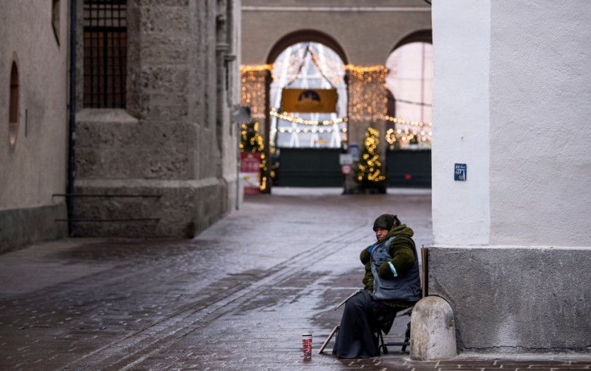 Una mujer pide limosna cerca de un mercadillo navideño en Salzburgo. Es posible ir al médico y a los centros de vacunación y test de covid, o hacer "uso de los instrumentos de la democracia", como la participación en manifestaciones. LUKAS BARTH REUTERS