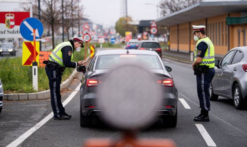 Dos policías piden la documentación al conductor de un vehículo en la frontera entre Alemania-Austria, en Salzburgo. Junto al nuevo confinamiento, el Gobierno austríaco anunció que a partir de febrero la vacuna contra la covid será obligatoria, una medida adoptada ante el bajo índice de inmunización de la población, que es a día de hoy del 66%, insuficiente para frenar la rápida propagación de la variante delta del coronavirus. LUKAS BARTH REUTERS