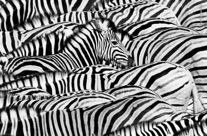 La vida en blanco y negro, Ecuador Decenas de cebras de las llanuras beben en el pozo de agua de Okaukuejo en el Parque Nacional Etosha, Namibia, un lugar para que los animales de la zona calmen su sed provocada por el calor abrasador del sol. Juntas se mueven como una sola, las cebras bajan la cabeza para buscar agua y, casi de inmediato, la vuelven a levantar robóticamente en busca de peligro. Las rayas le recordaron a Bustamante a un código de barras vivo. Su objetivo era capturar solo a una con la cabeza en alto.