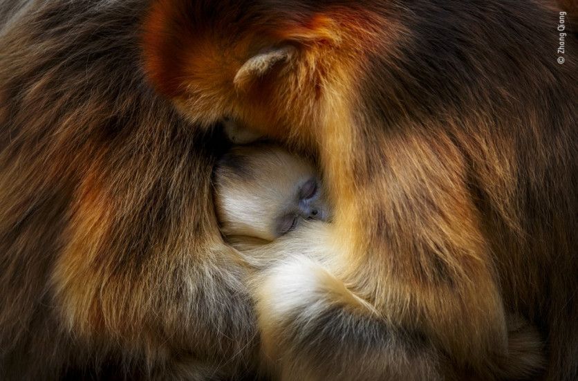 'Abrazo de mono', China Zhang Qiang estaba visitando las montañas Qinling de China para observar el comportamiento del mono de nariz chata de Sichuan. Los bosques templados de las montañas son el único hábitat de estos monos en peligro de extinción, amenazado por la alteración de su espacio. Al fotógrafo le encanta observar la dinámica del grupo familiar: lo cercanos y amables que son. Cuando llega el momento de descansar, las hembras y las crías se apiñan para abrigarse y protegerse. Esta imagen captura ese momento de intimidad. El rostro azul del joven mono se encuentra entre dos hembras, con su llamativo pelaje dorado salpicado de luz.