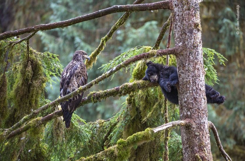 El águila y el oso, Países Bajos Los cachorros de oso negro a menudo trepan a los árboles, donde esperan a salvo a que su madre regrese con comida. Aquí, en las profundidades del bosque lluvioso templado de Anan en Alaska, este pequeño cachorro decidió tomar una siesta en una rama cubierta de musgo bajo la atenta mirada de un águila calva juvenil. El águila permaneció sentada en este pino durante horas mientras el oso dormía.