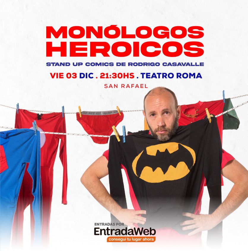 Monólogos Heroicos se presenta en San Rafael el próximo viernes 3 de diciembre a las 21 hs. en el Teatro Roma. Monólogos Heroicos es el unipersonal de stand up de Rodrigo Casavalle.