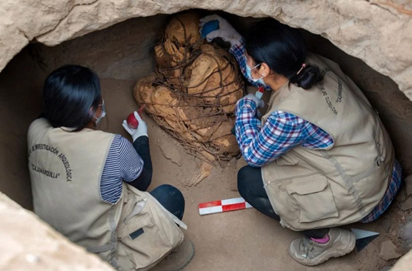 El descubrimiento ocurrió dentro de una cámara funeraria de unos tres metros de largo y a una profundidad de 1,40 metros en el sitio arqueológico Cajamarquilla, al este de Lima.