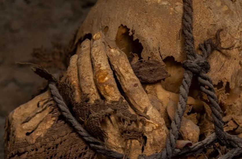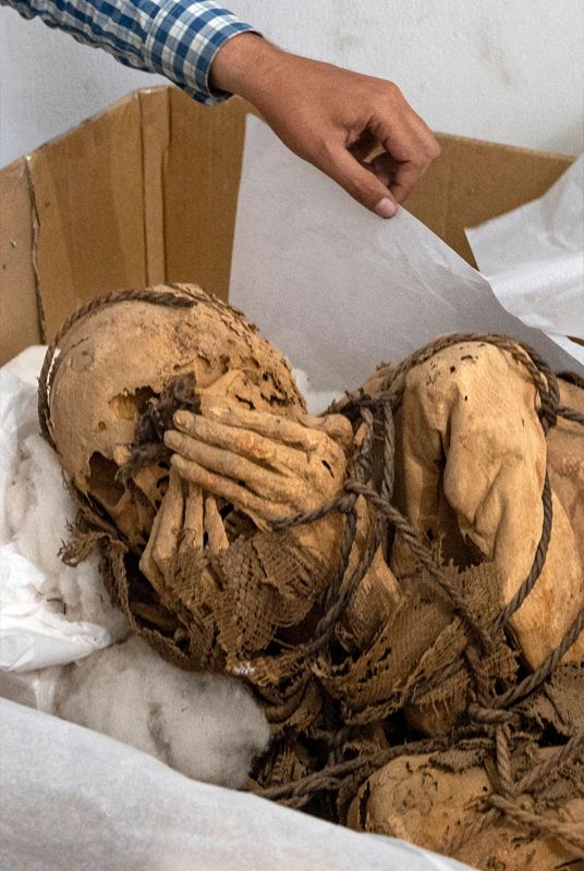 Arqueólogos peruanos hallaron una momia preinca de entre 800 y 1.200 años de antigüedad atada sorprendentemente con soguillas, mientras excavaban en un milenario complejo urbano de barro en la periferia de Lima.